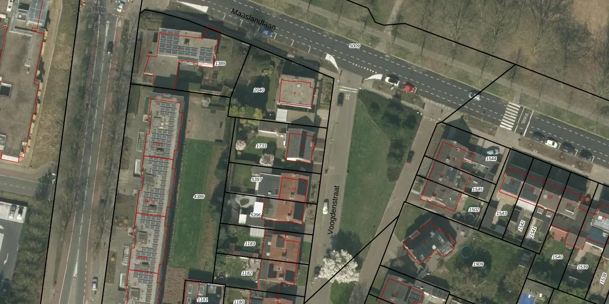 Het perceel waarop Voogdenstraat 13 staat heeft een oppervlakte van 447 m². Dit is een groot perceel. De perceeloppervlakte wordt geregistreerd door het Kadaster. Gedetailleerde informatie over de maten van dit perceel kunt u vinden in het rapport Kadastrale kaart met maatvoering van Voogdenstraat 13.