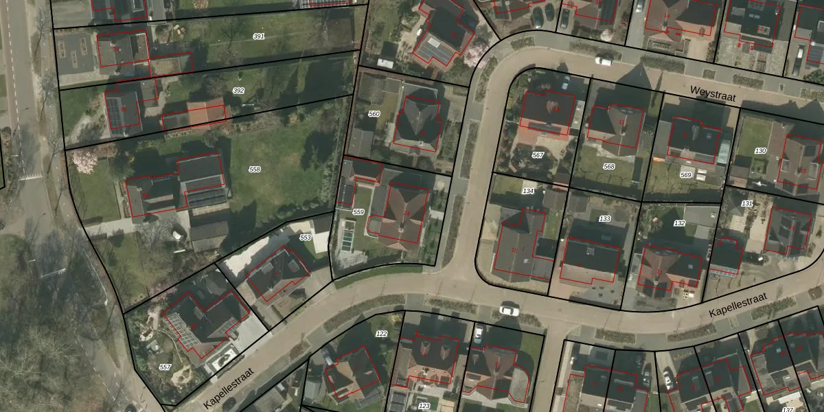 Het perceel waarop Weystraat 24 staat heeft een oppervlakte van 670 m². Dit is een groot perceel. De perceeloppervlakte wordt geregistreerd door het Kadaster. Gedetailleerde informatie over de maten van dit perceel kunt u vinden in het rapport Kadastrale kaart met maatvoering van Weystraat 24.