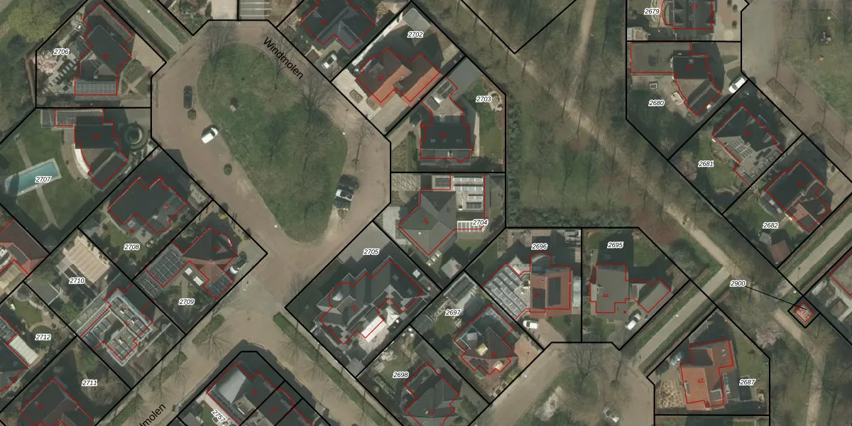 Het perceel waarop Windmolen 54 staat heeft een oppervlakte van 584 m². Dit is een groot perceel. De perceeloppervlakte wordt geregistreerd door het Kadaster. Gedetailleerde informatie over de maten van dit perceel kunt u vinden in het rapport Kadastrale kaart met maatvoering van Windmolen 54.