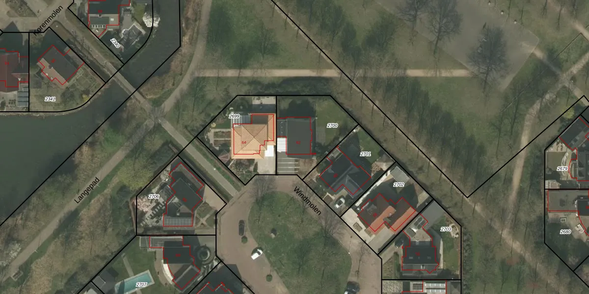 Het perceel waarop Windmolen 62 staat heeft een oppervlakte van 561 m². Dit is een groot perceel. De perceeloppervlakte wordt geregistreerd door het Kadaster. Gedetailleerde informatie over de maten van dit perceel kunt u vinden in het rapport Kadastrale kaart met maatvoering van Windmolen 62.