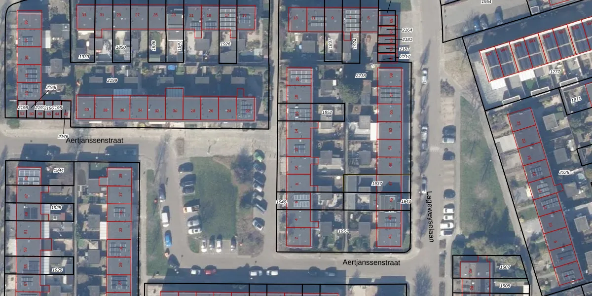 Het perceel waarop Aertjanssenstraat 12 staat heeft een oppervlakte van 2201 m². Dit is een zeer groot perceel. De perceeloppervlakte wordt geregistreerd door het Kadaster. Gedetailleerde informatie over de maten van dit perceel kunt u vinden in het rapport Kadastrale kaart met maatvoering van Aertjanssenstraat 12.
