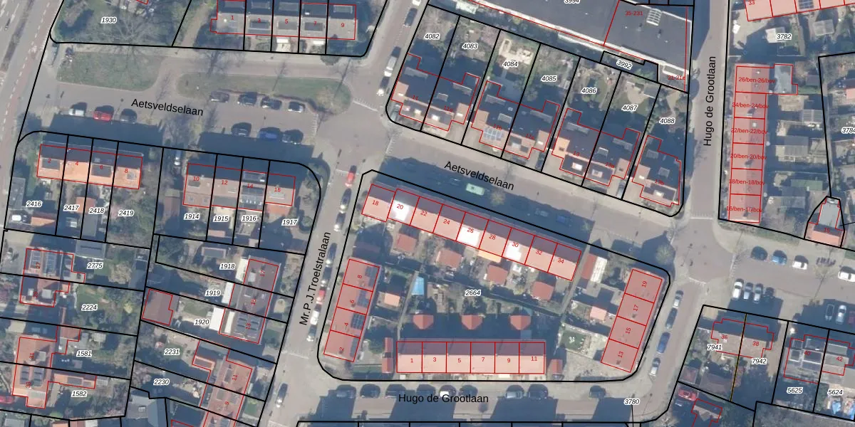 Het perceel waarop Aetsveldselaan 22 staat heeft een oppervlakte van 2903 m². Dit is een zeer groot perceel. De perceeloppervlakte wordt geregistreerd door het Kadaster. Gedetailleerde informatie over de maten van dit perceel kunt u vinden in het rapport Kadastrale kaart met maatvoering van Aetsveldselaan 22.