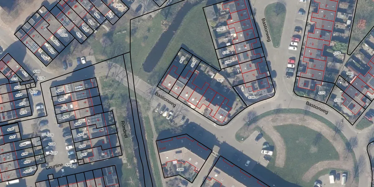 Het perceel waarop Bastionweg 5 staat heeft een oppervlakte van 955 m². Dit is een groot perceel. De perceeloppervlakte wordt geregistreerd door het Kadaster. Gedetailleerde informatie over de maten van dit perceel kunt u vinden in het rapport Kadastrale kaart met maatvoering van Bastionweg 5.