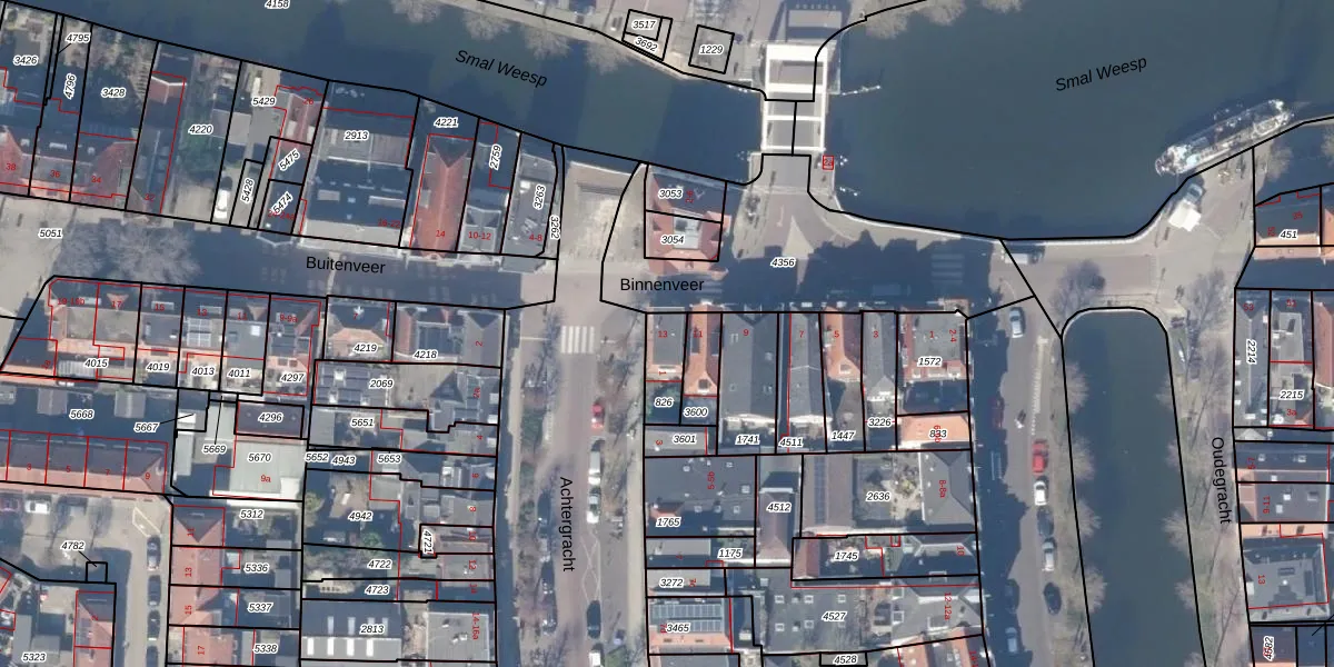 Het perceel waarop Binnenveer 13 staat heeft een oppervlakte van 88 m². Dit is een klein perceel. De perceeloppervlakte wordt geregistreerd door het Kadaster. Gedetailleerde informatie over de maten van dit perceel kunt u vinden in het rapport Kadastrale kaart met maatvoering van Binnenveer 13.