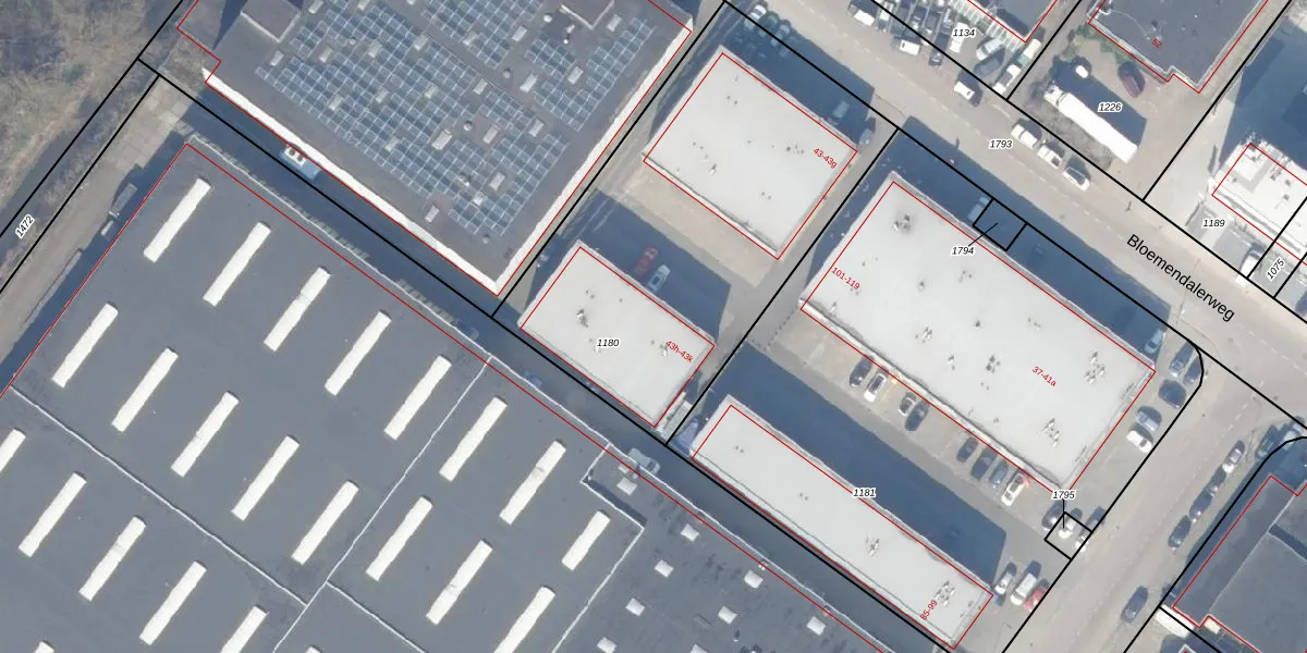 Het perceel waarop Bloemendalerweg 43-i staat heeft een oppervlakte van 1975 m². Dit is een zeer groot perceel. De perceeloppervlakte wordt geregistreerd door het Kadaster. Gedetailleerde informatie over de maten van dit perceel kunt u vinden in het rapport Kadastrale kaart met maatvoering van Bloemendalerweg 43-i.