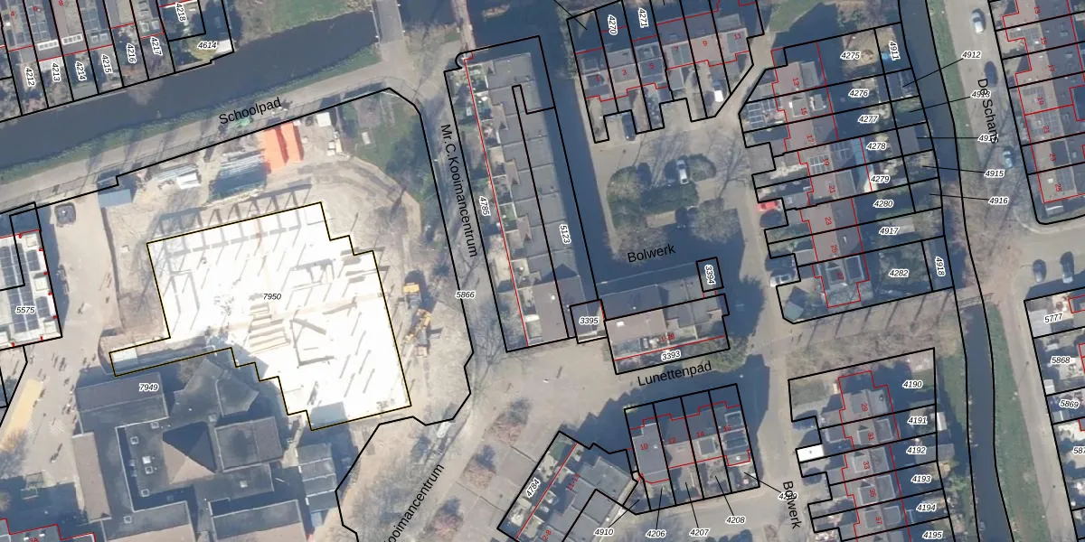 Het perceel waarop Bolwerk 16 staat heeft een oppervlakte van 719 m². Dit is een groot perceel. De perceeloppervlakte wordt geregistreerd door het Kadaster. Gedetailleerde informatie over de maten van dit perceel kunt u vinden in het rapport Kadastrale kaart met maatvoering van Bolwerk 16.