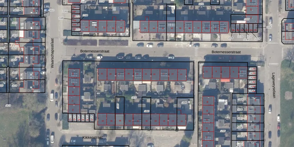 Boternesserstraat 21 is gelegen op kadastraal perceel WEE02C1970. Deze kadastrale aanduiding is uniek en wordt gebruikt door het Kadaster om eigendomsrechten en andere zakelijke rechten vast te leggen. Het perceel maakt onderdeel uit van de kadastrale gemeente Weesp.