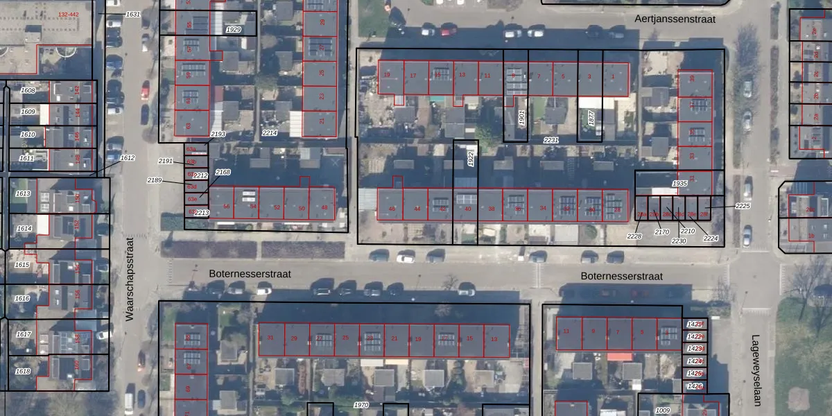 Boternesserstraat 44 is gelegen op kadastraal perceel WEE02C2231. Deze kadastrale aanduiding is uniek en wordt gebruikt door het Kadaster om eigendomsrechten en andere zakelijke rechten vast te leggen. Het perceel maakt onderdeel uit van de kadastrale gemeente Weesp.
