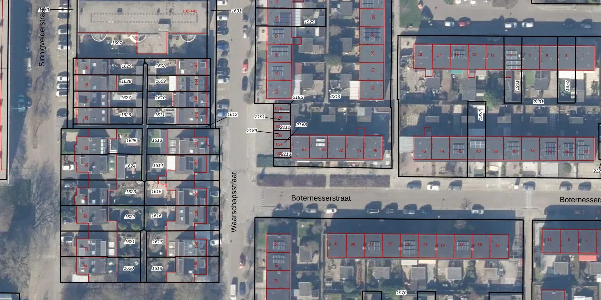 Het perceel waarop Boternesserstraat 56 staat heeft een oppervlakte van 3141 m². Dit is een zeer groot perceel. De perceeloppervlakte wordt geregistreerd door het Kadaster. Gedetailleerde informatie over de maten van dit perceel kunt u vinden in het rapport Kadastrale kaart met maatvoering van Boternesserstraat 56.