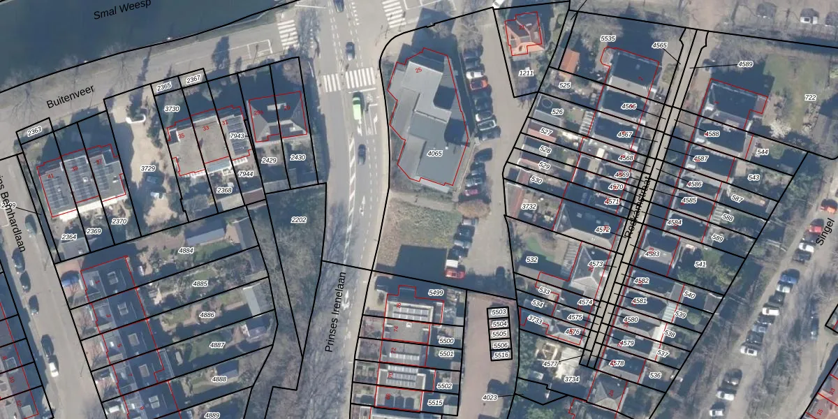 Het adres is gelegen op perceel 4065 in de sectie B en de kadastrale gemeente Weesp. De kadastrale aanduiding is aldus WEE02-B-4065. De gemiddelde perceelgrootte in Weesp is 2523,05 m². Dit perceel is kleiner: de perceeloppervlakte bedraagt 1875 m². Het grootste perceel in de kadastrale gemeente is 27,8 ha. Het kleinste perceel heeft een oppervlakte van 0 m². Op het perceel liggen in totaal 14 adressen. De huidige grenzen van het perceel zijn digitaal in de Basisregistratie Kadaster (BRK) geregistreerd op 08-12-2010.