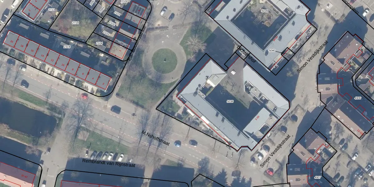 Het perceel waarop Dichtershof 33 staat heeft een oppervlakte van 2158 m². Dit is een zeer groot perceel. De perceeloppervlakte wordt geregistreerd door het Kadaster. Gedetailleerde informatie over de maten van dit perceel kunt u vinden in het rapport Kadastrale kaart met maatvoering van Dichtershof 33.