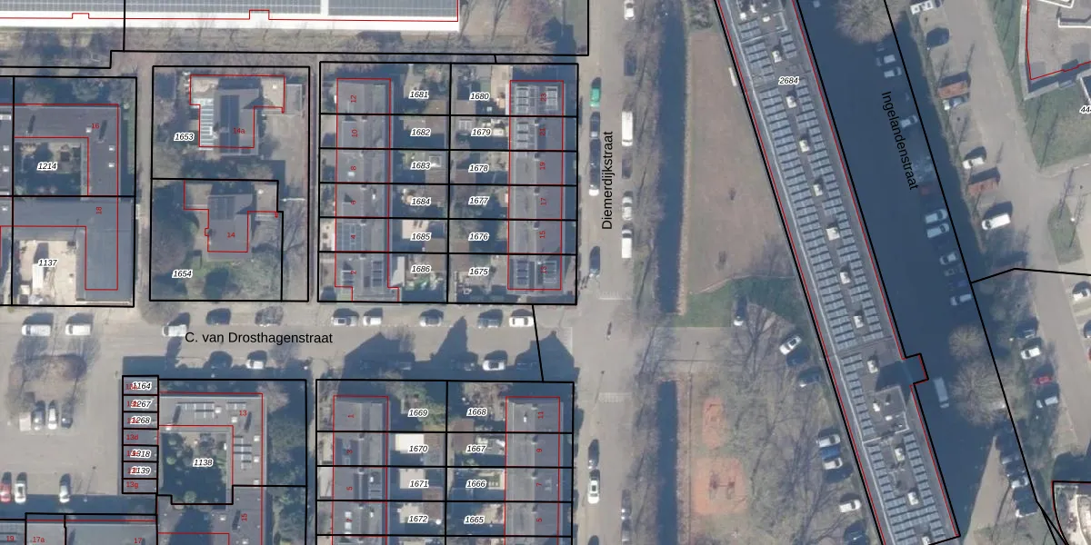 Het perceel waarop Diemerdijkstraat 13 staat heeft een oppervlakte van 218 m². Dit is een middelgroot perceel. De perceeloppervlakte wordt geregistreerd door het Kadaster. Gedetailleerde informatie over de maten van dit perceel kunt u vinden in het rapport Kadastrale kaart met maatvoering van Diemerdijkstraat 13.