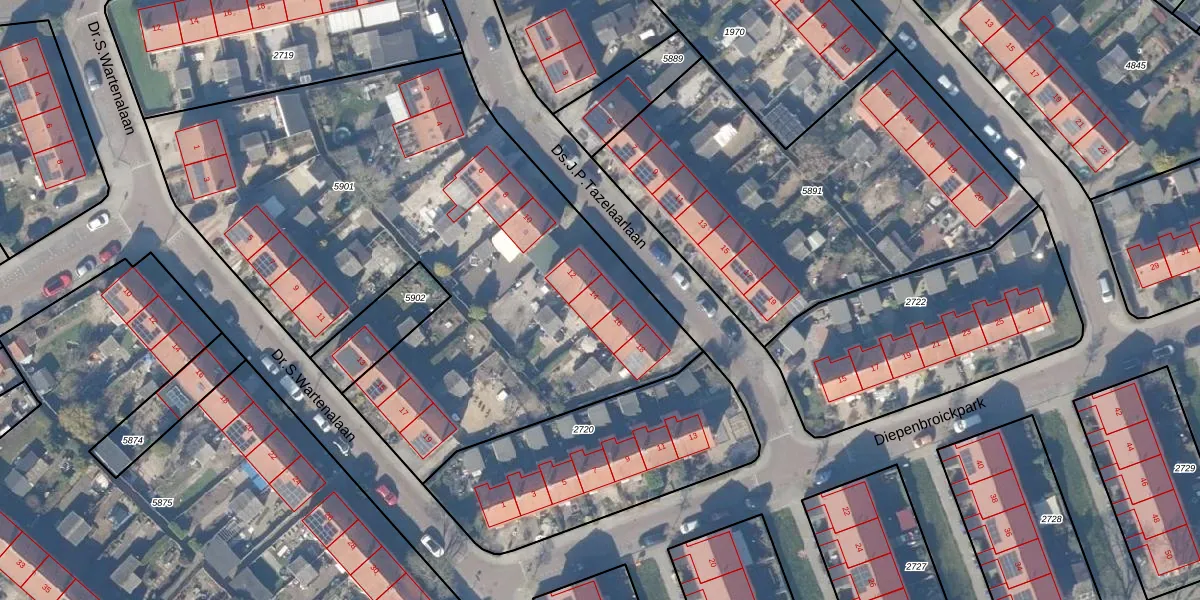 Ds.J.P.Tazelaarlaan 14 is gelegen op kadastraal perceel WEE02B5901. Deze kadastrale aanduiding is uniek en wordt gebruikt door het Kadaster om eigendomsrechten en andere zakelijke rechten vast te leggen. Het perceel maakt onderdeel uit van de kadastrale gemeente Weesp.