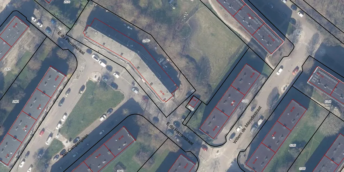 Het perceel waarop E.du Perronstraat 16 staat heeft een oppervlakte van 1850 m². Dit is een zeer groot perceel. De perceeloppervlakte wordt geregistreerd door het Kadaster. Gedetailleerde informatie over de maten van dit perceel kunt u vinden in het rapport Kadastrale kaart met maatvoering van E.du Perronstraat 16.