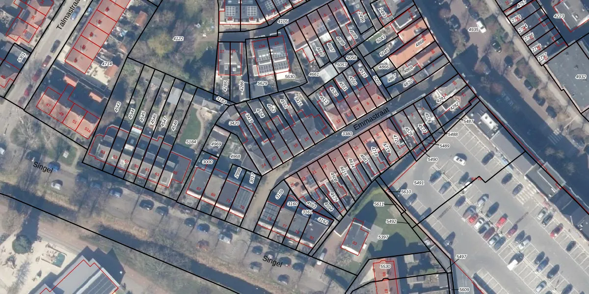 Het perceel waarop Emmastraat 18 staat heeft een oppervlakte van 93 m². Dit is een klein perceel. De perceeloppervlakte wordt geregistreerd door het Kadaster. Gedetailleerde informatie over de maten van dit perceel kunt u vinden in het rapport Kadastrale kaart met maatvoering van Emmastraat 18.