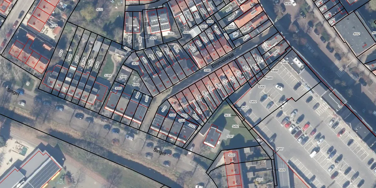 Het perceel waarop Emmastraat 21 staat heeft een oppervlakte van 82 m². Dit is een klein perceel. De perceeloppervlakte wordt geregistreerd door het Kadaster. Gedetailleerde informatie over de maten van dit perceel kunt u vinden in het rapport Kadastrale kaart met maatvoering van Emmastraat 21.