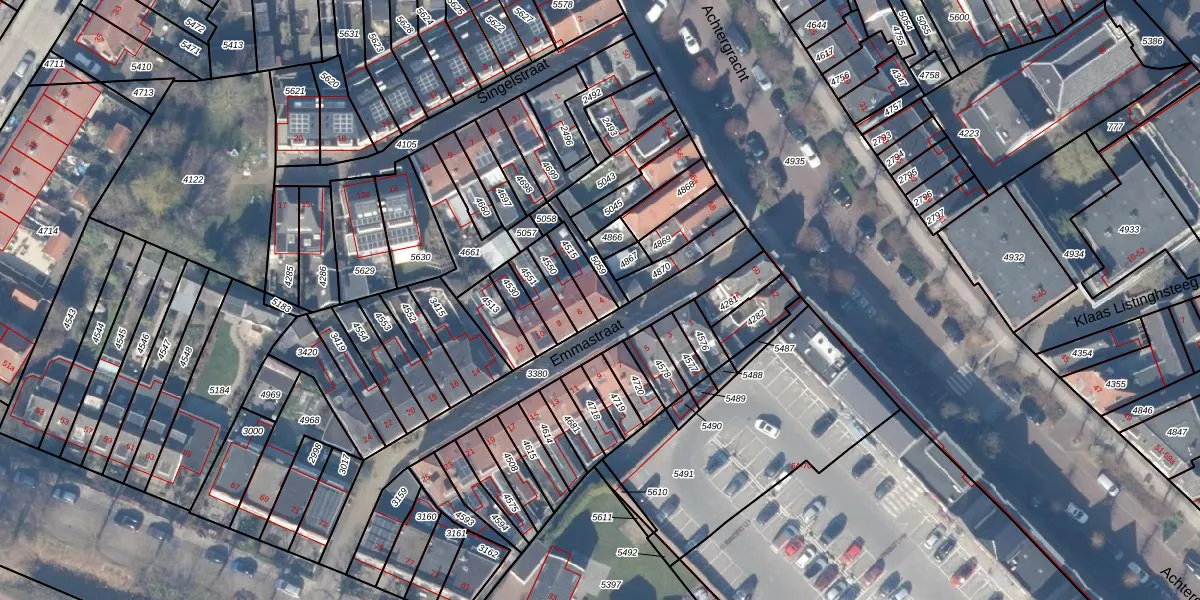 Het perceel waarop Emmastraat 4 staat heeft een oppervlakte van 67 m². Dit is een klein perceel. De perceeloppervlakte wordt geregistreerd door het Kadaster. Gedetailleerde informatie over de maten van dit perceel kunt u vinden in het rapport Kadastrale kaart met maatvoering van Emmastraat 4.