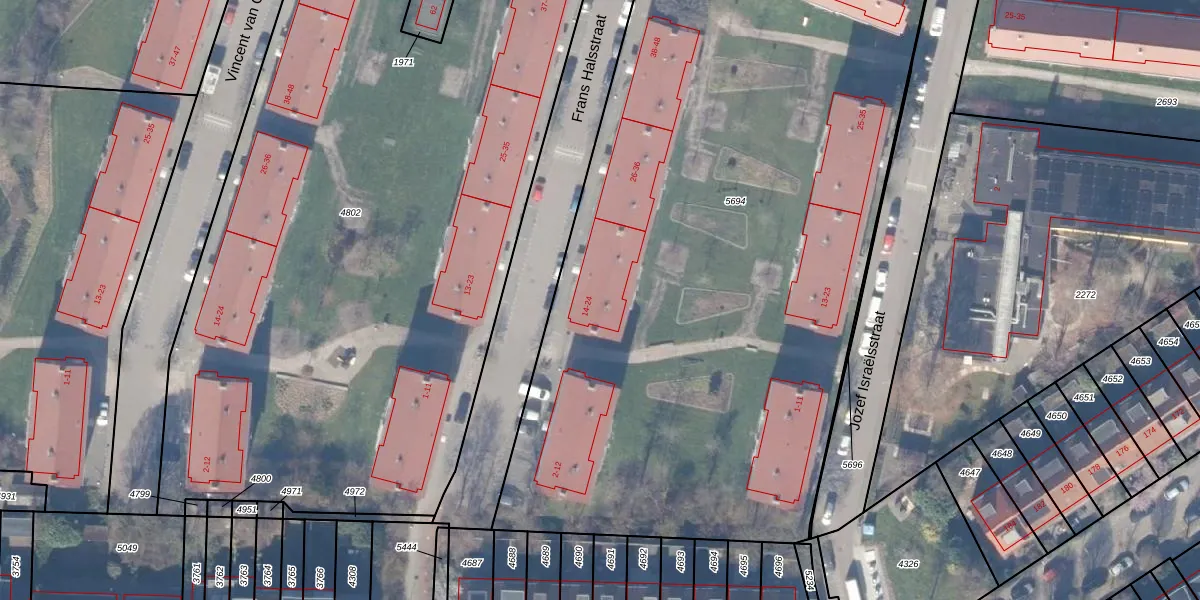 Het perceel waarop Frans Halsstraat 16 staat heeft een oppervlakte van 5300 m². Dit is een zeer groot perceel. De perceeloppervlakte wordt geregistreerd door het Kadaster. Gedetailleerde informatie over de maten van dit perceel kunt u vinden in het rapport Kadastrale kaart met maatvoering van Frans Halsstraat 16.