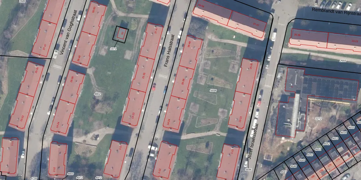 Het perceel waarop Frans Halsstraat 28 staat heeft een oppervlakte van 5300 m². Dit is een zeer groot perceel. De perceeloppervlakte wordt geregistreerd door het Kadaster. Gedetailleerde informatie over de maten van dit perceel kunt u vinden in het rapport Kadastrale kaart met maatvoering van Frans Halsstraat 28.