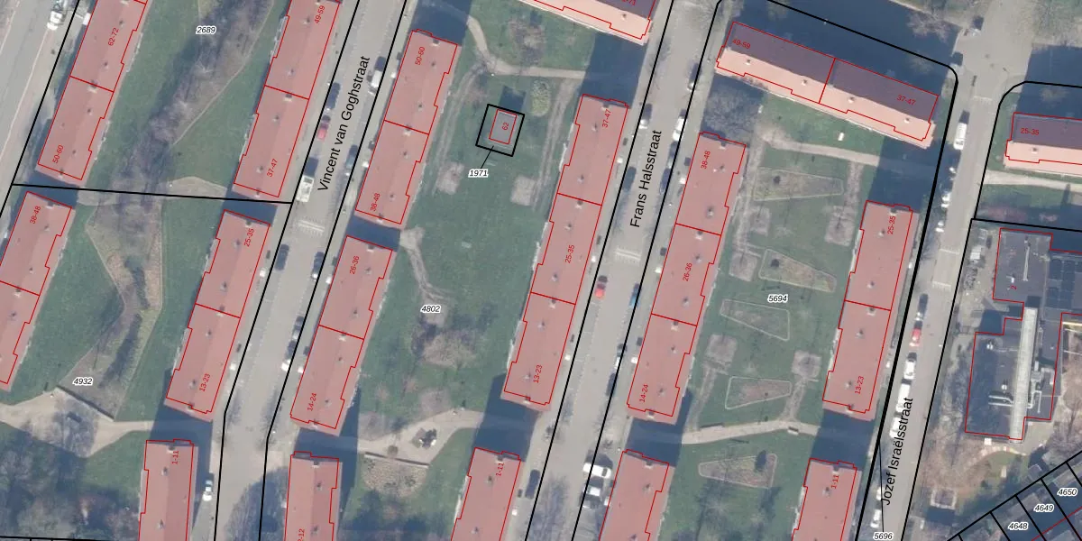 Het perceel waarop Frans Halsstraat 29 staat heeft een oppervlakte van 6067 m². Dit is een zeer groot perceel. De perceeloppervlakte wordt geregistreerd door het Kadaster. Gedetailleerde informatie over de maten van dit perceel kunt u vinden in het rapport Kadastrale kaart met maatvoering van Frans Halsstraat 29.