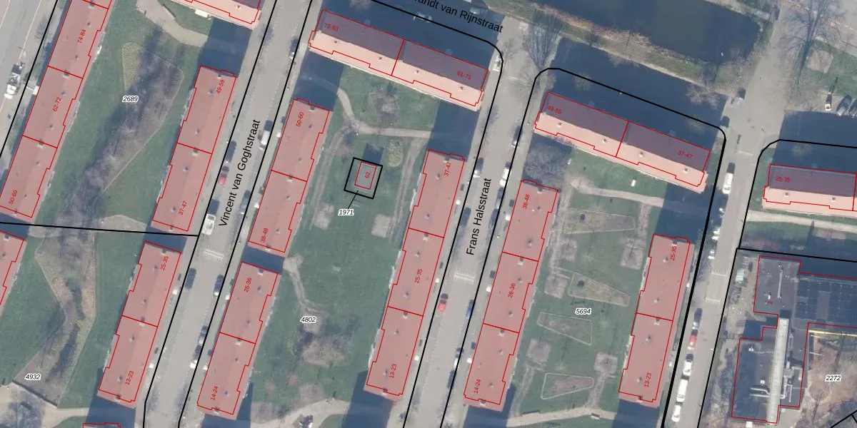Het perceel waarop Frans Halsstraat 39 staat heeft een oppervlakte van 6067 m². Dit is een zeer groot perceel. De perceeloppervlakte wordt geregistreerd door het Kadaster. Gedetailleerde informatie over de maten van dit perceel kunt u vinden in het rapport Kadastrale kaart met maatvoering van Frans Halsstraat 39.