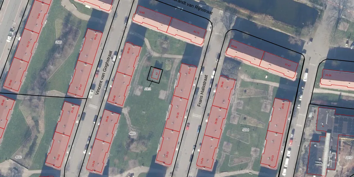 Het perceel waarop Frans Halsstraat 41 staat heeft een oppervlakte van 6067 m². Dit is een zeer groot perceel. De perceeloppervlakte wordt geregistreerd door het Kadaster. Gedetailleerde informatie over de maten van dit perceel kunt u vinden in het rapport Kadastrale kaart met maatvoering van Frans Halsstraat 41.