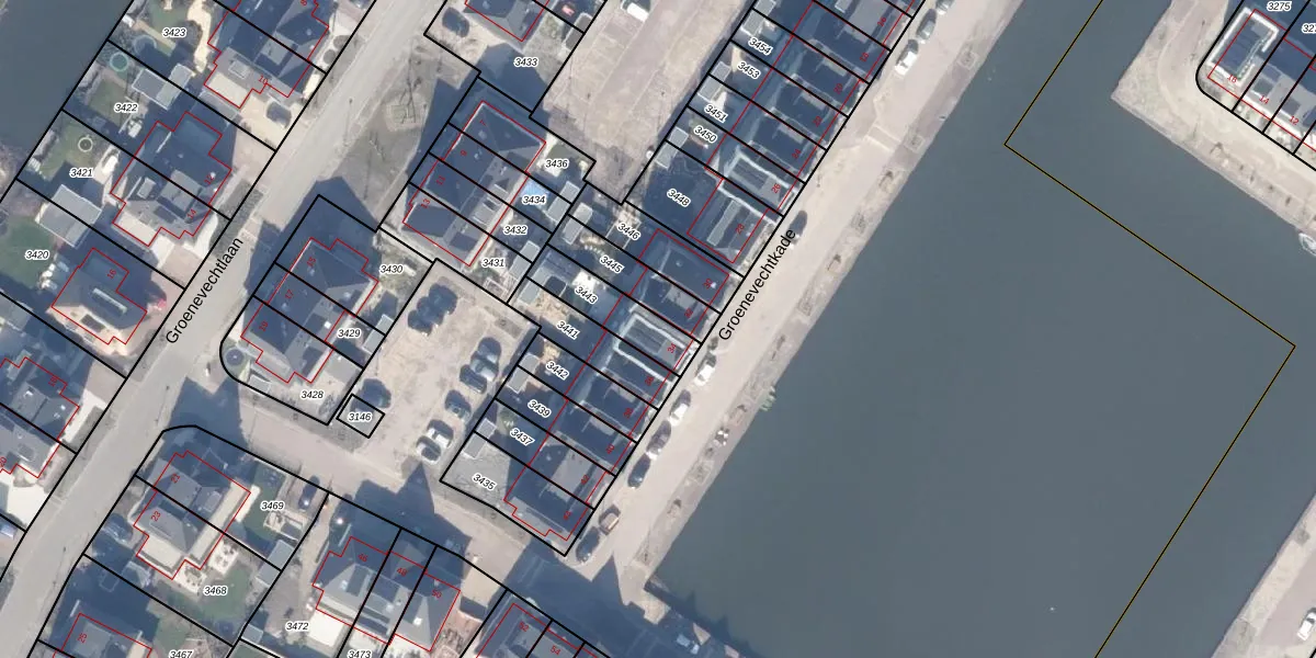 Groenevechtkade 34 is gelegen op kadastraal perceel WEE02F3443. Deze kadastrale aanduiding is uniek en wordt gebruikt door het Kadaster om eigendomsrechten en andere zakelijke rechten vast te leggen. Het perceel maakt onderdeel uit van de kadastrale gemeente Weesp.