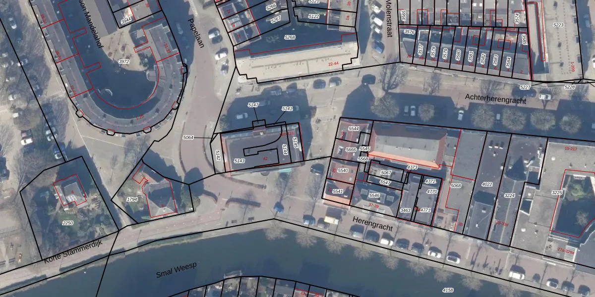 Het perceel waarop Herengracht 42 staat heeft een oppervlakte van 54 m². Dit is een klein perceel. De perceeloppervlakte wordt geregistreerd door het Kadaster. Gedetailleerde informatie over de maten van dit perceel kunt u vinden in het rapport Kadastrale kaart met maatvoering van Herengracht 42.