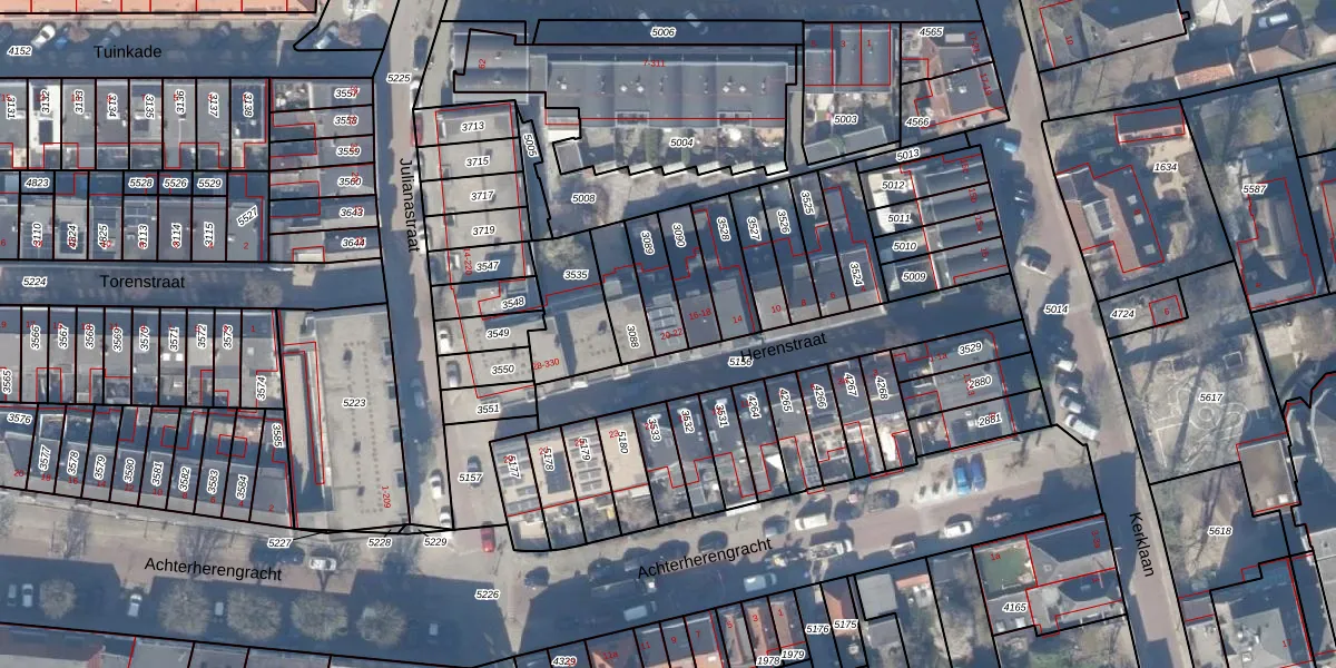 Het perceel waarop Herenstraat 20 staat heeft een oppervlakte van 104 m². Dit is een middelgroot perceel. De perceeloppervlakte wordt geregistreerd door het Kadaster. Gedetailleerde informatie over de maten van dit perceel kunt u vinden in het rapport Kadastrale kaart met maatvoering van Herenstraat 20.