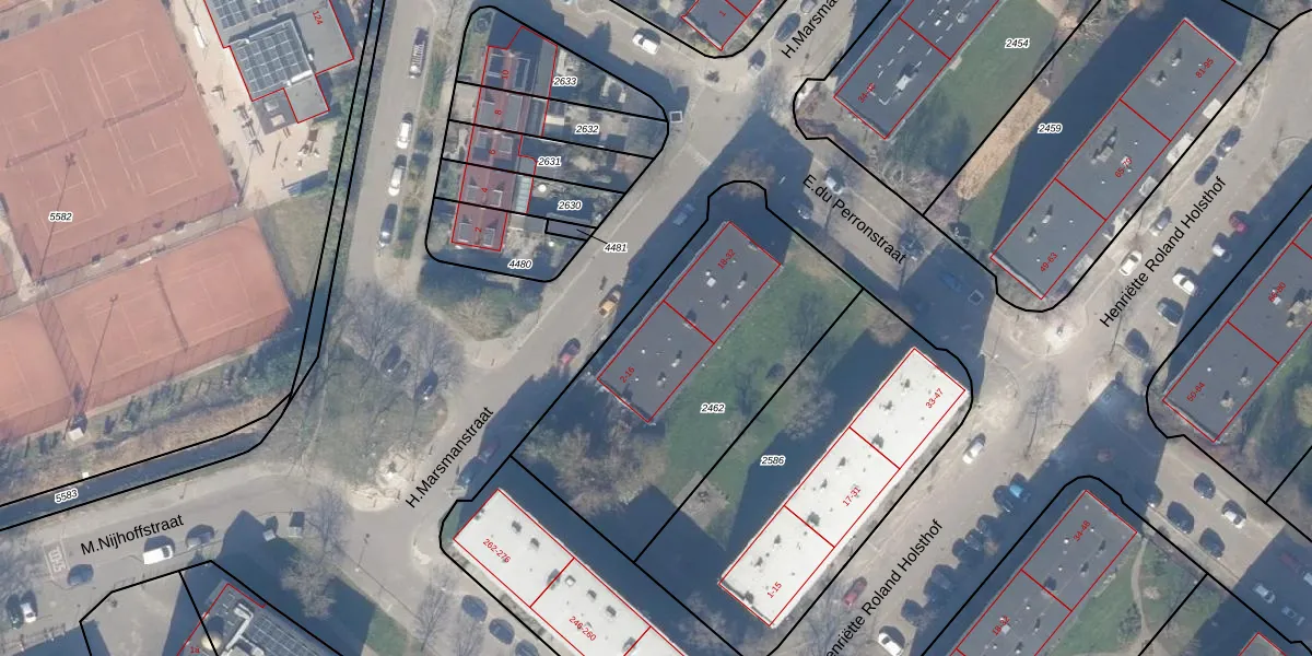 Het perceel waarop H.Marsmanstraat 10 staat heeft een oppervlakte van 1366 m². Dit is een zeer groot perceel. De perceeloppervlakte wordt geregistreerd door het Kadaster. Gedetailleerde informatie over de maten van dit perceel kunt u vinden in het rapport Kadastrale kaart met maatvoering van H.Marsmanstraat 10.