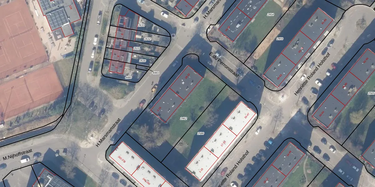 Het perceel waarop H.Marsmanstraat 24 staat heeft een oppervlakte van 1366 m². Dit is een zeer groot perceel. De perceeloppervlakte wordt geregistreerd door het Kadaster. Gedetailleerde informatie over de maten van dit perceel kunt u vinden in het rapport Kadastrale kaart met maatvoering van H.Marsmanstraat 24.