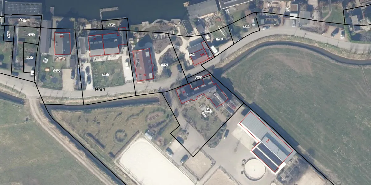 Het perceel waarop Horn 25 staat heeft een oppervlakte van 988 m². Dit is een groot perceel. De perceeloppervlakte wordt geregistreerd door het Kadaster. Gedetailleerde informatie over de maten van dit perceel kunt u vinden in het rapport Kadastrale kaart met maatvoering van Horn 25.