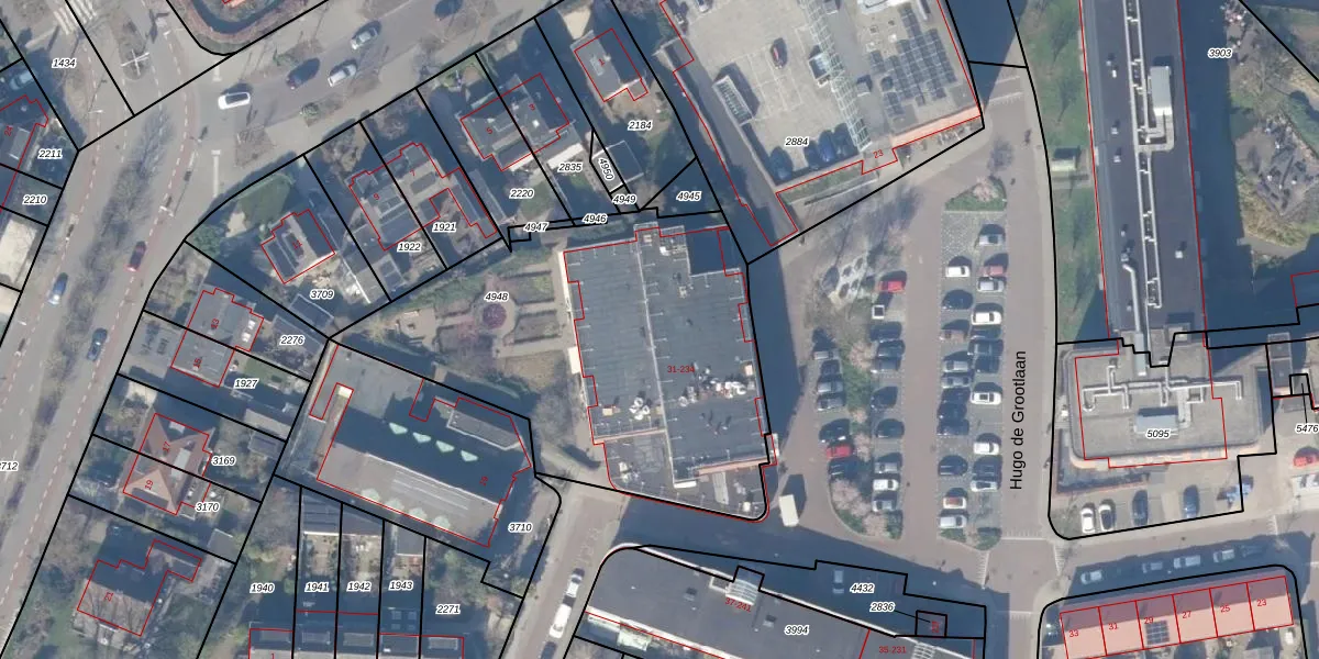 Hugo de Grootlaan 233 is gelegen op kadastraal perceel WEE02B4948. Deze kadastrale aanduiding is uniek en wordt gebruikt door het Kadaster om eigendomsrechten en andere zakelijke rechten vast te leggen. Het perceel maakt onderdeel uit van de kadastrale gemeente Weesp.