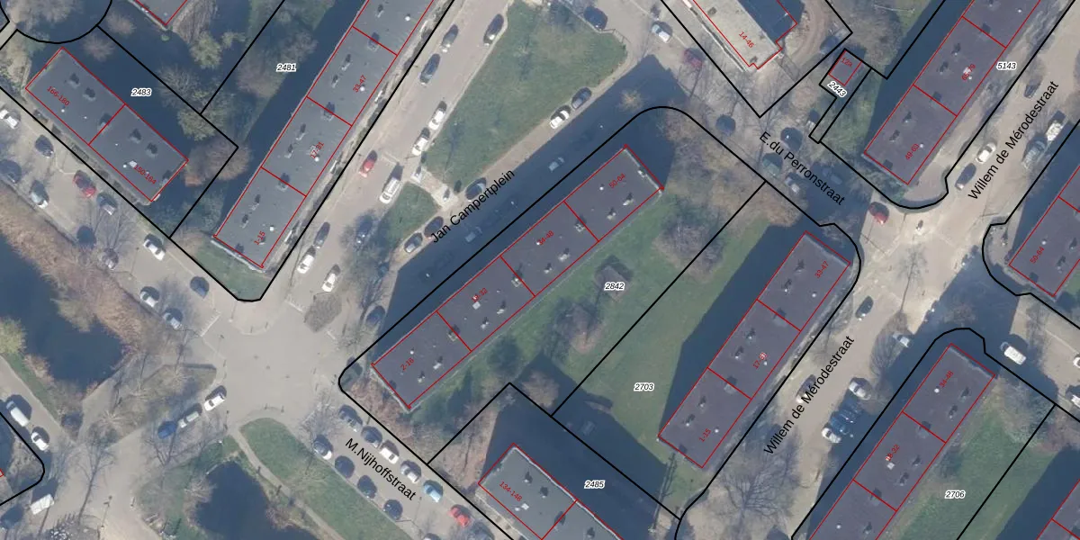Het perceel waarop Jan Campertplein 38 staat heeft een oppervlakte van 2134 m². Dit is een zeer groot perceel. De perceeloppervlakte wordt geregistreerd door het Kadaster. Gedetailleerde informatie over de maten van dit perceel kunt u vinden in het rapport Kadastrale kaart met maatvoering van Jan Campertplein 38.