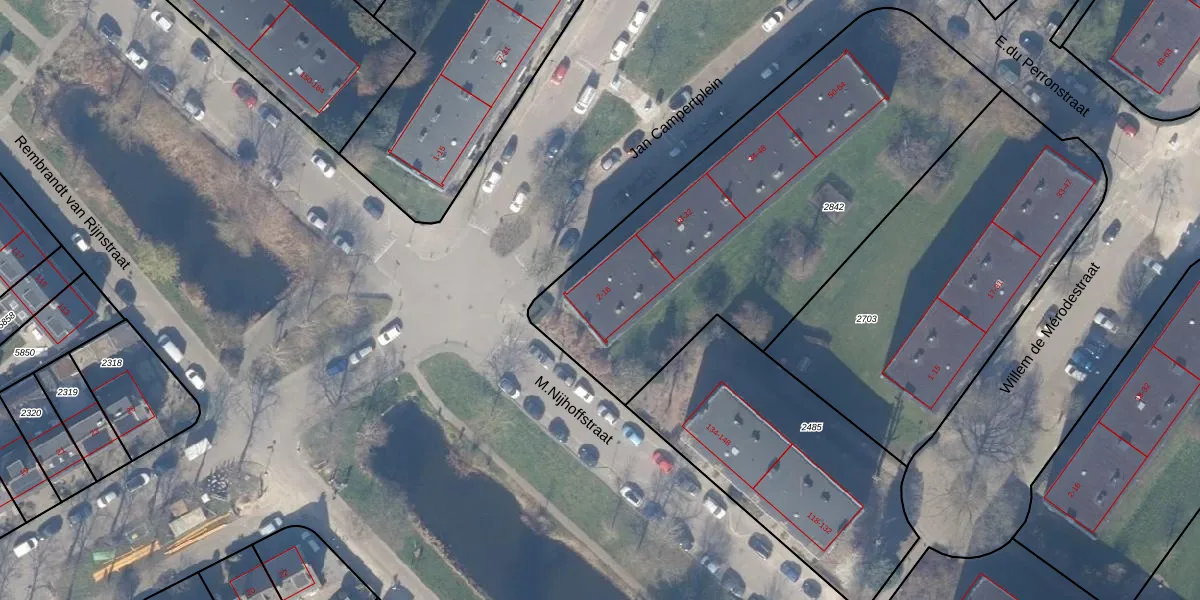Het perceel waarop Jan Campertplein 4 staat heeft een oppervlakte van 2134 m². Dit is een zeer groot perceel. De perceeloppervlakte wordt geregistreerd door het Kadaster. Gedetailleerde informatie over de maten van dit perceel kunt u vinden in het rapport Kadastrale kaart met maatvoering van Jan Campertplein 4.