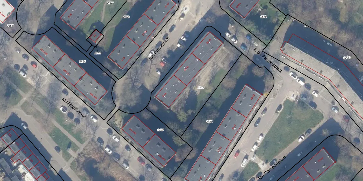 Het perceel waarop Jan Prinsstraat 16 staat heeft een oppervlakte van 1481 m². Dit is een zeer groot perceel. De perceeloppervlakte wordt geregistreerd door het Kadaster. Gedetailleerde informatie over de maten van dit perceel kunt u vinden in het rapport Kadastrale kaart met maatvoering van Jan Prinsstraat 16.