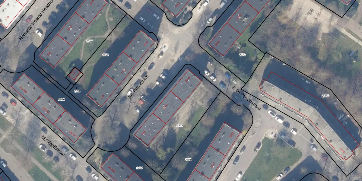 Het perceel waarop Jan Prinsstraat 36 staat heeft een oppervlakte van 1481 m². Dit is een zeer groot perceel. De perceeloppervlakte wordt geregistreerd door het Kadaster. Gedetailleerde informatie over de maten van dit perceel kunt u vinden in het rapport Kadastrale kaart met maatvoering van Jan Prinsstraat 36.