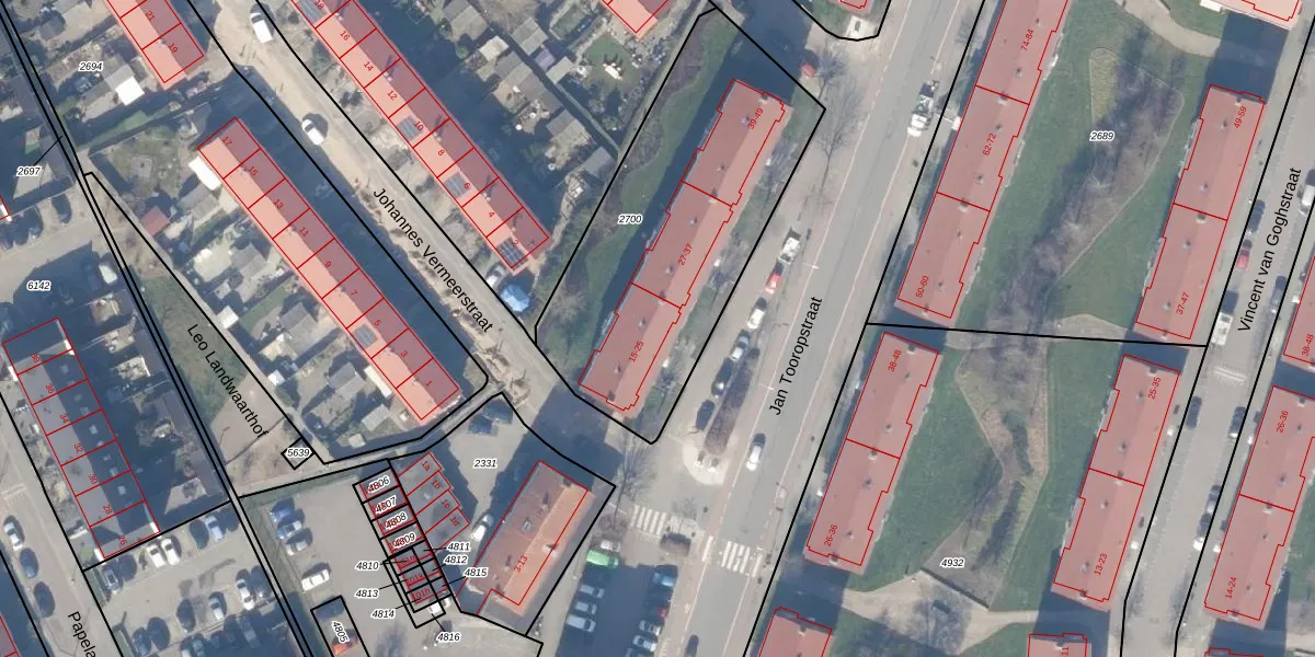 Het perceel waarop Jan Tooropstraat 21 staat heeft een oppervlakte van 1415 m². Dit is een zeer groot perceel. De perceeloppervlakte wordt geregistreerd door het Kadaster. Gedetailleerde informatie over de maten van dit perceel kunt u vinden in het rapport Kadastrale kaart met maatvoering van Jan Tooropstraat 21.