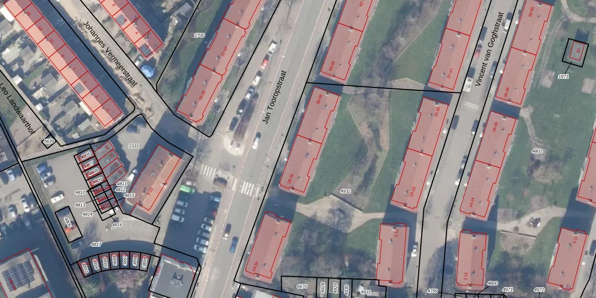 Het perceel waarop Jan Tooropstraat 32 staat heeft een oppervlakte van 3654 m². Dit is een zeer groot perceel. De perceeloppervlakte wordt geregistreerd door het Kadaster. Gedetailleerde informatie over de maten van dit perceel kunt u vinden in het rapport Kadastrale kaart met maatvoering van Jan Tooropstraat 32.