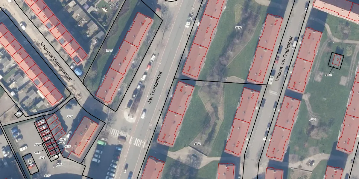 Het perceel waarop Jan Tooropstraat 44 staat heeft een oppervlakte van 3654 m². Dit is een zeer groot perceel. De perceeloppervlakte wordt geregistreerd door het Kadaster. Gedetailleerde informatie over de maten van dit perceel kunt u vinden in het rapport Kadastrale kaart met maatvoering van Jan Tooropstraat 44.