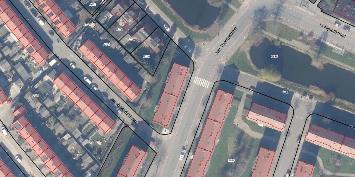 Het perceel waarop Jan Tooropstraat 63 staat heeft een oppervlakte van 3110 m². Dit is een zeer groot perceel. De perceeloppervlakte wordt geregistreerd door het Kadaster. Gedetailleerde informatie over de maten van dit perceel kunt u vinden in het rapport Kadastrale kaart met maatvoering van Jan Tooropstraat 63.