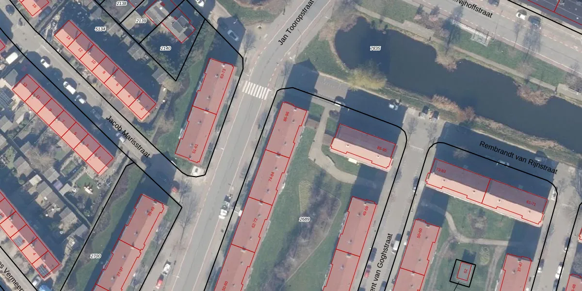 Het perceel waarop Jan Tooropstraat 90 staat heeft een oppervlakte van 3541 m². Dit is een zeer groot perceel. De perceeloppervlakte wordt geregistreerd door het Kadaster. Gedetailleerde informatie over de maten van dit perceel kunt u vinden in het rapport Kadastrale kaart met maatvoering van Jan Tooropstraat 90.