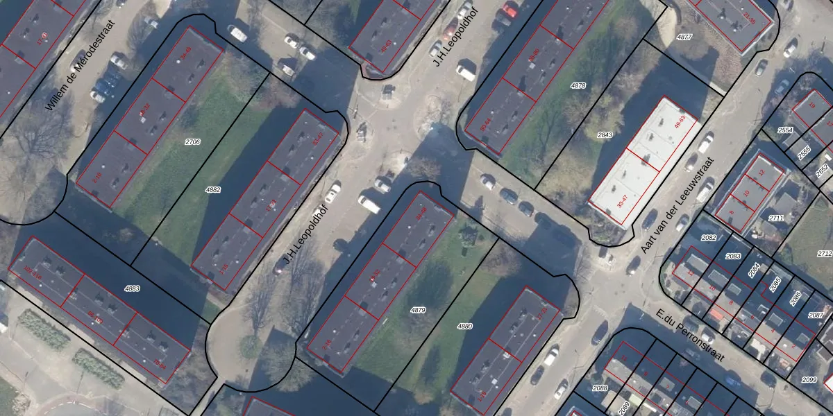 Het perceel waarop J.H.Leopoldhof 42 staat heeft een oppervlakte van 1305 m². Dit is een zeer groot perceel. De perceeloppervlakte wordt geregistreerd door het Kadaster. Gedetailleerde informatie over de maten van dit perceel kunt u vinden in het rapport Kadastrale kaart met maatvoering van J.H.Leopoldhof 42.