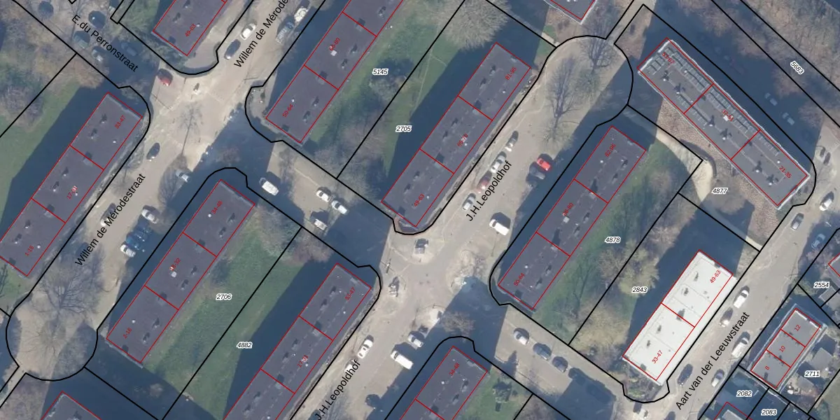 Het perceel waarop J.H.Leopoldhof 49 staat heeft een oppervlakte van 1394 m². Dit is een zeer groot perceel. De perceeloppervlakte wordt geregistreerd door het Kadaster. Gedetailleerde informatie over de maten van dit perceel kunt u vinden in het rapport Kadastrale kaart met maatvoering van J.H.Leopoldhof 49.