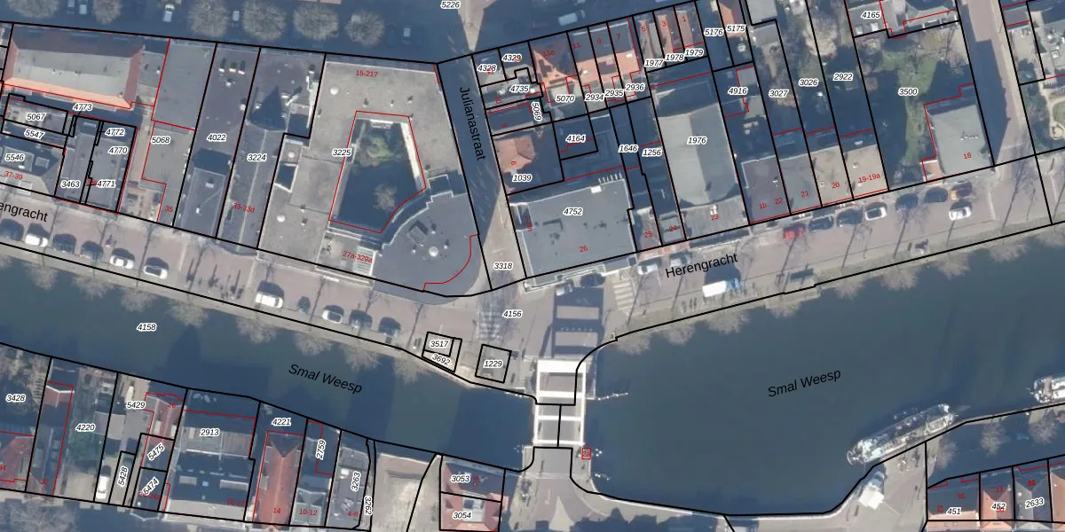 Het adres is gelegen op perceel 4752 in de sectie A en de kadastrale gemeente Weesp. De kadastrale aanduiding is aldus WEE02-A-4752. De gemiddelde perceelgrootte in Weesp is 2523,05 m². Dit perceel is kleiner: de perceeloppervlakte bedraagt 437 m². De grootste perceeloppervlakte in de kadastrale gemeente is 27,8 ha. De kleinste oppervlakte bedraagt 0 m². Op het perceel liggen in totaal 14 adressen. De huidige grenzen van het perceel zijn digitaal in de Basisregistratie Kadaster (BRK) geregistreerd op 28-12-1998.