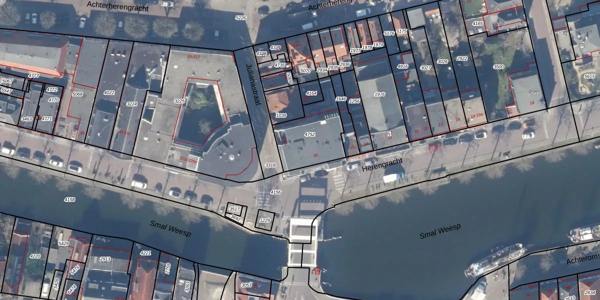 Het adres is gelegen op perceel 4752 in de sectie A en de kadastrale gemeente Weesp. De kadastrale aanduiding is aldus WEE02-A-4752. De gemiddelde perceelgrootte in Weesp is 2523,05 m². Dit perceel is kleiner: de perceeloppervlakte bedraagt 437 m². Het grootste perceel in de kadastrale gemeente is 27,8 ha. Het kleinste perceel heeft een oppervlakte van 0 m². Er zijn 14 adressen aanwezig op het perceel. De laatste wijziging in het de Basisregistratie Kadaster (BRK) was op 28-12-1998.