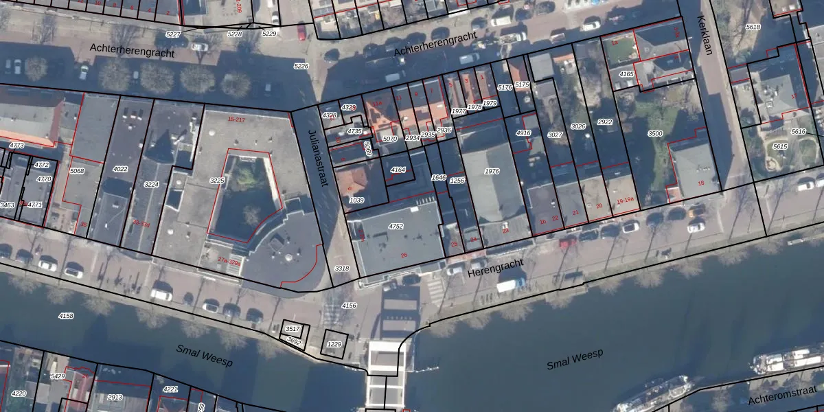 Het adres is gelegen op perceel 4752 in de sectie A en de kadastrale gemeente Weesp. De kadastrale aanduiding is aldus WEE02-A-4752. De gemiddelde perceelgrootte in Weesp is 2523,05 m². Dit perceel is kleiner: de perceeloppervlakte bedraagt 437 m². Het grootste perceel in de kadastrale gemeente is 27,8 ha. Het kleinste perceel heeft een oppervlakte van 0 m². Op het perceel zijn 14 adressen aanwezig. In de Basisregistratie Kadaster (BRK) werden de grenzen van het perceel geregistreerd op 28-12-1998.