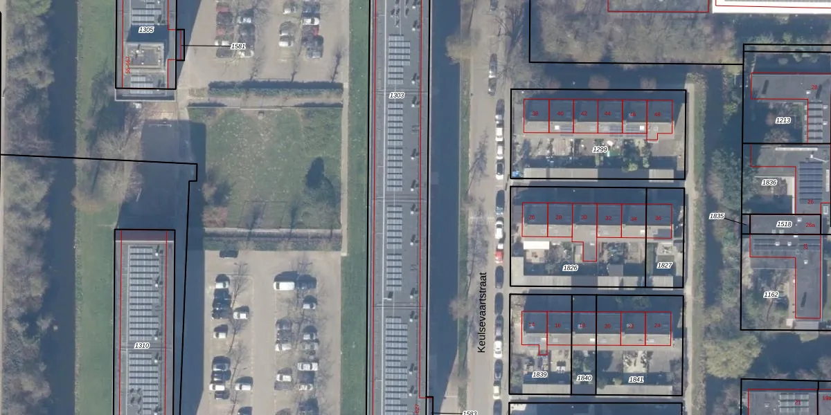 Het perceel waarop Keulsevaartstraat 13 staat heeft een oppervlakte van 1877 m². Dit is een zeer groot perceel. De perceeloppervlakte wordt geregistreerd door het Kadaster. Gedetailleerde informatie over de maten van dit perceel kunt u vinden in het rapport Kadastrale kaart met maatvoering van Keulsevaartstraat 13.