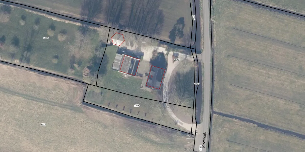 Het perceel waarop Keverdijk 18 staat heeft een oppervlakte van 2433 m². Dit is een zeer groot perceel. De perceeloppervlakte wordt geregistreerd door het Kadaster. Gedetailleerde informatie over de maten van dit perceel kunt u vinden in het rapport Kadastrale kaart met maatvoering van Keverdijk 18.