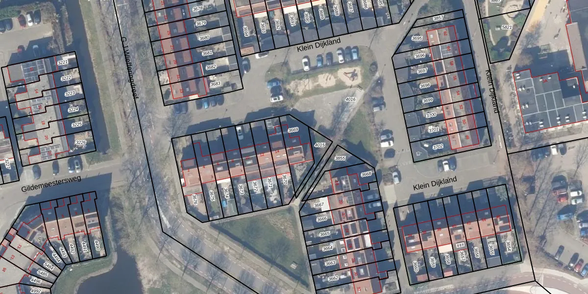 Klein Dijkland 16 is gelegen op kadastraal perceel WEE02B3669. Deze kadastrale aanduiding is uniek en wordt gebruikt door het Kadaster om eigendomsrechten en andere zakelijke rechten vast te leggen. Het perceel maakt onderdeel uit van de kadastrale gemeente Weesp.